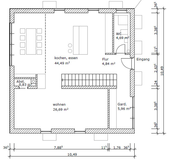 Grundriss EG Die Wohnebene lässt keine Wünsche offen. Die Highlights: große Garderobe, Küchenblock, zweigeschossiger Luftraum im Bereich des Esstisches, Galerie, offener Kamin als Raumteiler zentral im Raum.