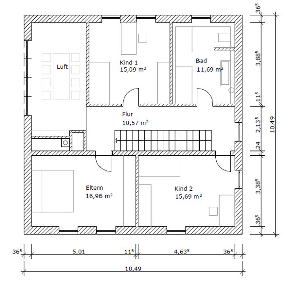 Grundriss OG Das OG kann entsprechend den Bauherrenbedürfnissen angepasst werden. Ankleide, 2 Bäder, 3 Kinderzimmer etc.